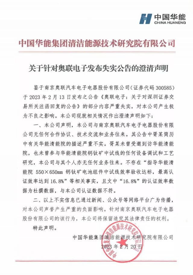華能清潔能源研究院發(fā)布針對(duì)奧聯(lián)電子發(fā)布失實(shí)公告的澄清聲明,公司聲明,公司與南京奧聯(lián)汽車電子電器股份有限公司無任何合作協(xié)議、技術(shù)交流和業(yè)務(wù)往來。