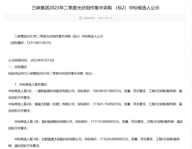 7月28日,三峽2023年二季度光伏組件集中采購(標(biāo)1)中標(biāo)結(jié)果公示,通威以1.3元/瓦的報價獨享2249.4MW的光伏組件訂單,組件型號為P型545W+雙面。
