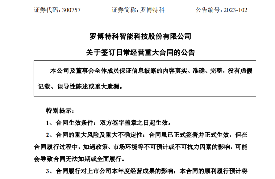 羅博特科表示,合同的簽訂預(yù)計(jì)將對(duì)公司及全資子公司南通羅博本年度及未來(lái)年度經(jīng)營(yíng)業(yè)績(jī)產(chǎn)生積極影響,公司及全資子公司南通羅博將根據(jù)合同要求以及收入確認(rèn)原則在相應(yīng)的會(huì)計(jì)期間確認(rèn)收入(最終以經(jīng)會(huì)計(jì)師事務(wù)所審計(jì)的數(shù)據(jù)為準(zhǔn))。