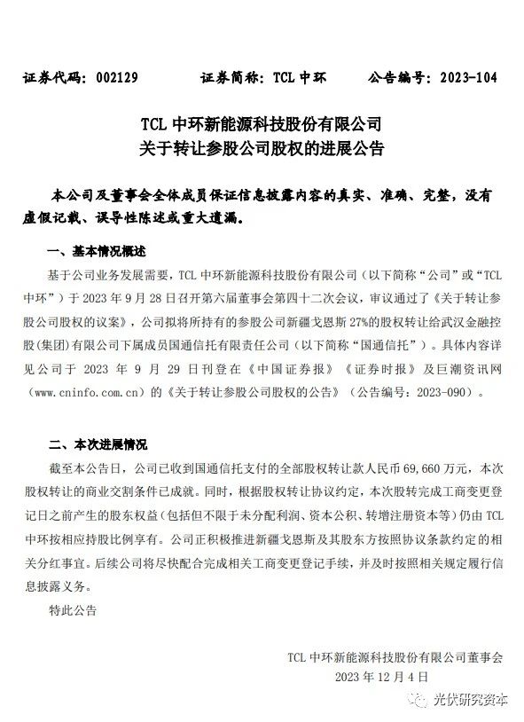 12月4日消息, TCL中環(huán)發(fā)布公告稱,公司已成功轉讓其所持有的新疆戈恩斯27%的股權給武漢金融控股(集團)有限公司下屬的國通信托有限責任公司,并已收到全部股權轉讓款人民幣6.97億元。根據(jù)股權轉讓協(xié)議,TCL中環(huán)在完成工商變更登記日之前仍享有相應股東權益。公司目前正在積極推進分紅事宜,并將盡快完成相關工商變更登記手續(xù)。