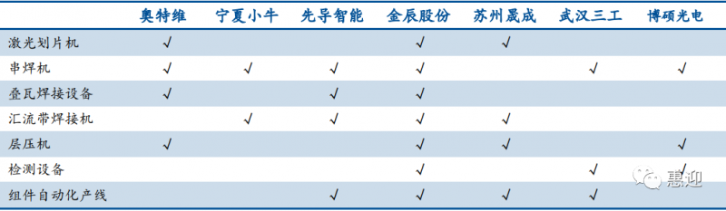 組件設備的市場較為分散,公司數(shù)量較多,競爭較為充分。組件設備國產化進程較早,廠商可提供多種產品,充分利用技術同源和客戶同源優(yōu)勢。如奧特維可提供激光劃片機、串焊機、疊瓦串焊機、層壓機等設備,先導智能可提供串焊機、疊瓦一體焊接機、匯流條焊接機等設備,金辰股份可提供激光劃片機、串焊機、疊片焊接機、層壓機、匯流條焊接機、層壓機、EL 測試儀等設備。同時,先導智能、金辰股份、蘇州晟成、武漢三工還可提供組件自動化生產線。
