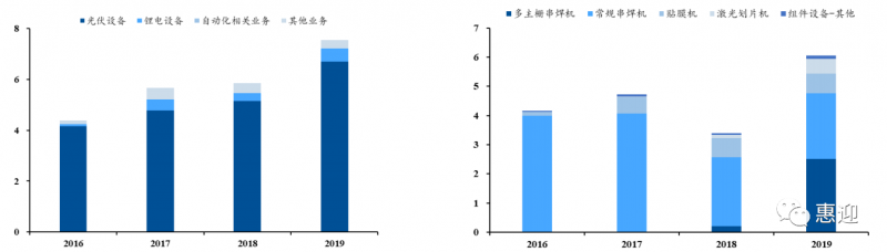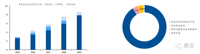 多主柵串焊機逐步成為公司光伏設備中的主要構成產品。2018 年,公司多主柵串焊機開始放量,在公司光伏設備收入中占比約為 5.88%,2019 年,公司多主柵串焊機收入從 0.2 億元提升至 2.52 億元,占光伏設備收入中的 40.91%,超越常規(guī)串焊機,成為公司光伏設備業(yè)務中占比最高的業(yè)務,成為公司的營業(yè)收入中占比最高的業(yè)務。未來,公司的串焊機有望深度受益于光伏組件技術迭代,在新一輪市場擴展中占據(jù)優(yōu)勢地位。