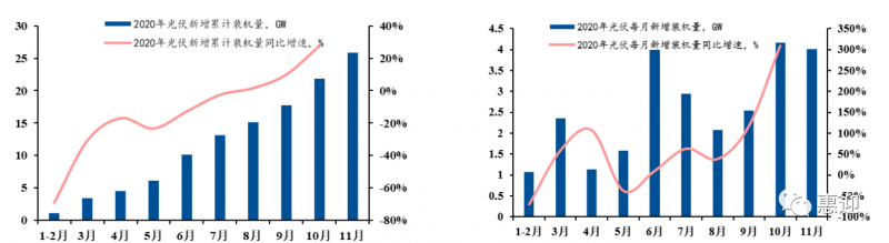 2020 年,我國新增光伏裝機量為 48.2GW,同比增長 81.7%,超過年內各機構預期。根據(jù)中電聯(lián)的數(shù)據(jù),我國光伏新增裝機量已在 2020 年下半年走出疫情的影響,光伏裝機量從 8 月份恢復至 19 年同期水平,10 月份新增的累計裝機量同比已實現(xiàn) 20%正增長,單月新增裝機規(guī)模超過 4GW,同比增長率高達300%。