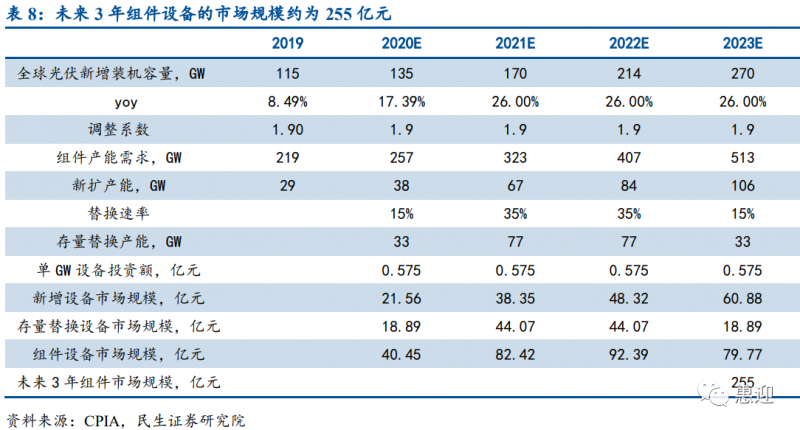 經民生證券測算,預計 2021 年、2022 年、2023 年組件設備的市場規(guī)??煞謩e達到 82.42 億元、92.39 億元和 79.77 億元,未來 3 年組件設備的市場規(guī)模合計可達 255 億元,組件設備廠商擁有廣闊的發(fā)展前景。