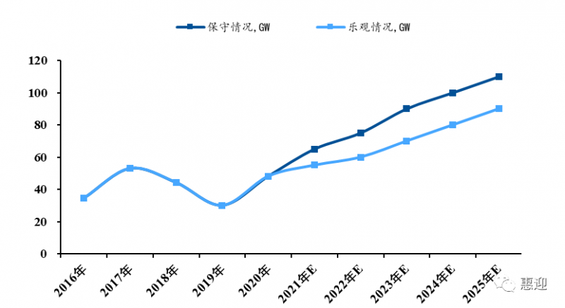 在中國向“30·60目標”邁進的過程中,“十四五”是實現(xiàn)碳達峰的關鍵時期,光伏發(fā)電大有可為。根據(jù) CPIA的觀察與分析,預計 2021 年新增裝機規(guī)模約為 55GW-65GW,預計“十四五”期間,國內年均光伏新增裝機規(guī)模將達 70-90GW。由此推算,未來 5 年,光伏新增總裝機規(guī)模有望達到 350-450GW,同比“十三五”期間 210GW 的新增總裝機規(guī)模有較大幅度提升。