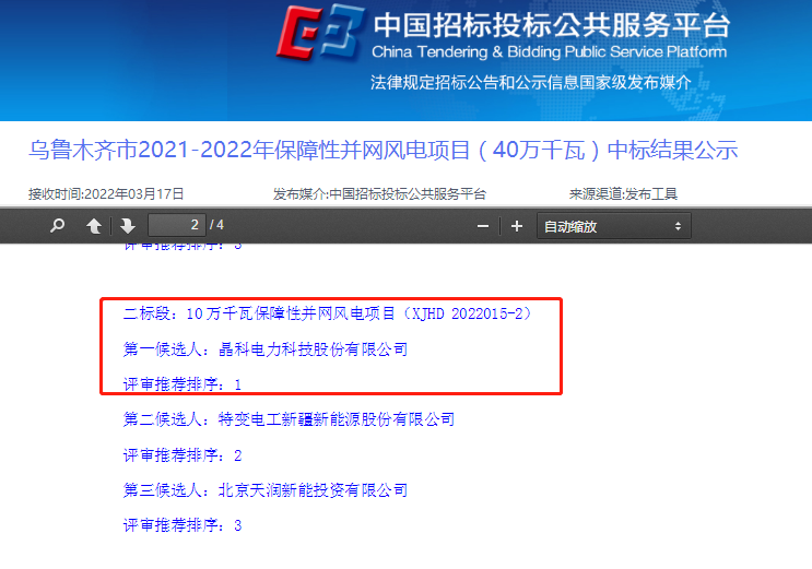 近日,烏魯木齊市2021-2022年保障性并網(wǎng)風(fēng)電項(xiàng)目(40萬千瓦)中標(biāo)結(jié)果公示,晶科科技(601778.SH)憑借領(lǐng)先的技術(shù)及良好的行業(yè)口碑,中標(biāo)了其中10萬千瓦(100MW)規(guī)模的保障性并網(wǎng)風(fēng)電項(xiàng)目。此次中標(biāo),是晶科科技成立以來首次獲得風(fēng)電項(xiàng)目,也是公司推動(dòng)可再生、清潔能源開發(fā)利用之路上新的里程碑,標(biāo)志著公司正式進(jìn)軍風(fēng)電市場。