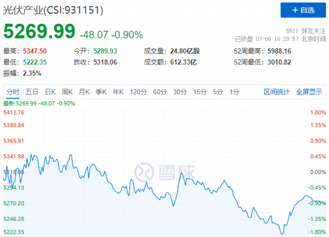7月6日,光伏板塊迎來分化行情,中證光伏產(chǎn)業(yè)指數(shù)(CSI:931151)早盤在金剛線、組件、逆變器、設備個股的帶動下創(chuàng)出近期反彈新高,隨后硅料、硅片個股震蕩下跌,拖累指數(shù)盤中跌幅一度達到1.78%。截至收盤,中證光伏產(chǎn)業(yè)指數(shù)報收5270點,跌幅收窄至0.9%。