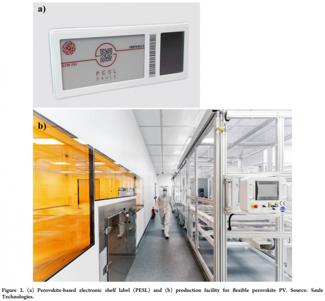 市場規(guī)模和增長當(dāng)然不是唯一需要考慮的重要方面。從制造商的角度來看,開發(fā)定制量最少的產(chǎn)品很重要,因?yàn)檫@會帶來額外的風(fēng)險(xiǎn)和成本。此外,如何將額外的功率預(yù)算貨幣化是非常重要的??紤]到所有這些,電子貨架標(biāo)簽似乎是最有吸引力的選擇之一。Saule 開發(fā)的基于鈣鈦礦的電子貨架標(biāo)簽 (PESL) 的示例和用于制造柔性鈣鈦礦 PV 的試點(diǎn)生產(chǎn)設(shè)施如圖 2 所示。