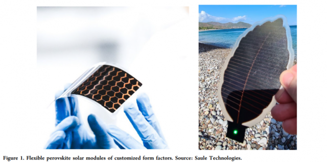 塑料箔的使用還為光伏產(chǎn)品提供了一系列新的優(yōu)勢,其中非成本相關(guān)因素可以提供重要的杠桿作用,例如重量輕、比功率高以及易于與各種表面集成。(7) 將鈣鈦礦與成熟的光伏技術(shù)區(qū)分開來的一個(gè)重要因素是高水平產(chǎn)品定制的可能性,符合客戶在特定應(yīng)用中的需求。 這可以在同時(shí)進(jìn)入市場的同時(shí)實(shí)現(xiàn)更長時(shí)間的技術(shù)孵化,從而緩解大規(guī)模市場進(jìn)入的挑戰(zhàn)。(8) 定制的柔性鈣鈦礦太陽能組件示例如圖 1 所示。