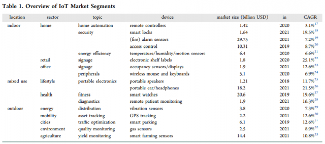 雖然物聯(lián)網(wǎng)市場巨大且增長迅速,但要確定能量收集的最佳應(yīng)用并非易事。用例將定義需要由太陽能模塊提供的功率預(yù)算。放置設(shè)備的環(huán)境和產(chǎn)品的外形尺寸定義了可能收集的能量的邊界條件。最重要的是,從業(yè)務(wù)角度來看,整合應(yīng)該是有意義的,因此需要進(jìn)行仔細(xì)的成本/收益分析,同時(shí)考慮到環(huán)境影響。為了解決這些問題,Saule的方法是查看物聯(lián)網(wǎng)應(yīng)用程序中最大和增長最快的部分,并按位置、部門、設(shè)備類型和價(jià)值主張對其進(jìn)行分類。表 1 總結(jié)了一些已識別的機(jī)會。