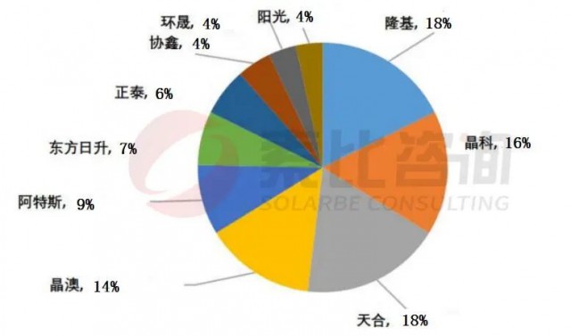 具體到企業(yè)層面來(lái)看,組件生產(chǎn)企業(yè)中產(chǎn)能大于10GW/年的有10家,合計(jì)產(chǎn)能332.5GW/年,產(chǎn)量約21.5GW,占總產(chǎn)量的83.8%;產(chǎn)量排名前五分別為:隆基、晶科、天合、晶澳及阿特斯,平均開(kāi)工率為75.6%,Top5合計(jì)產(chǎn)量16.2GW,約占總產(chǎn)量的63.4%。