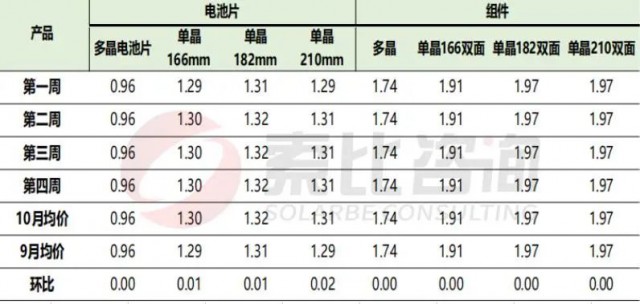 根據(jù)索比咨詢(xún)對(duì)多家組件制造商的調(diào)研:就10月組件價(jià)格行情來(lái)看,單晶166雙面均價(jià)1.91元/W,較9月環(huán)比持平;單晶182雙面均價(jià)1.97元/W,較9月環(huán)比持平;單晶210雙面均價(jià)1.97元/W,較9月環(huán)比持平。