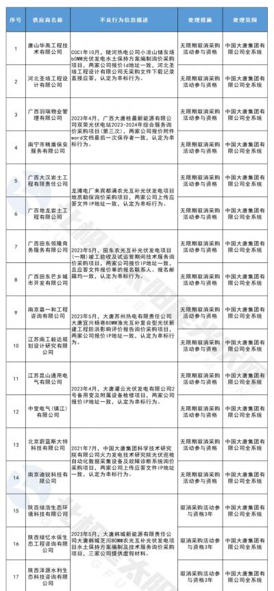 根據(jù)統(tǒng)計(jì),共有34個(gè)光伏相關(guān)企業(yè),17個(gè)光伏項(xiàng)目不良行為被大唐集團(tuán)處理,通知表示,相關(guān)供應(yīng)商可在上述處理期結(jié)束前1個(gè)月,向招標(biāo)人提出整改驗(yàn)收申請,經(jīng)相關(guān)單位或部門驗(yàn)收合格后方能解除處理。