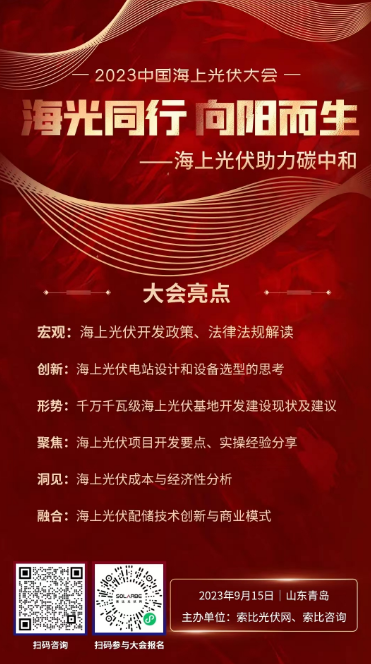 2023年9月15日,索比光伏網(wǎng)以“海光同行,向陽而生——海上光伏助力碳中和”為主題,計劃在山東青島舉辦“2023中國海上光伏大會”,為協(xié)力打造技術(shù)先進(jìn)、生態(tài)友好、智慧融合的“環(huán)渤海、沿黃?!彪p千萬千瓦級海上光伏基地貢獻(xiàn)力量。