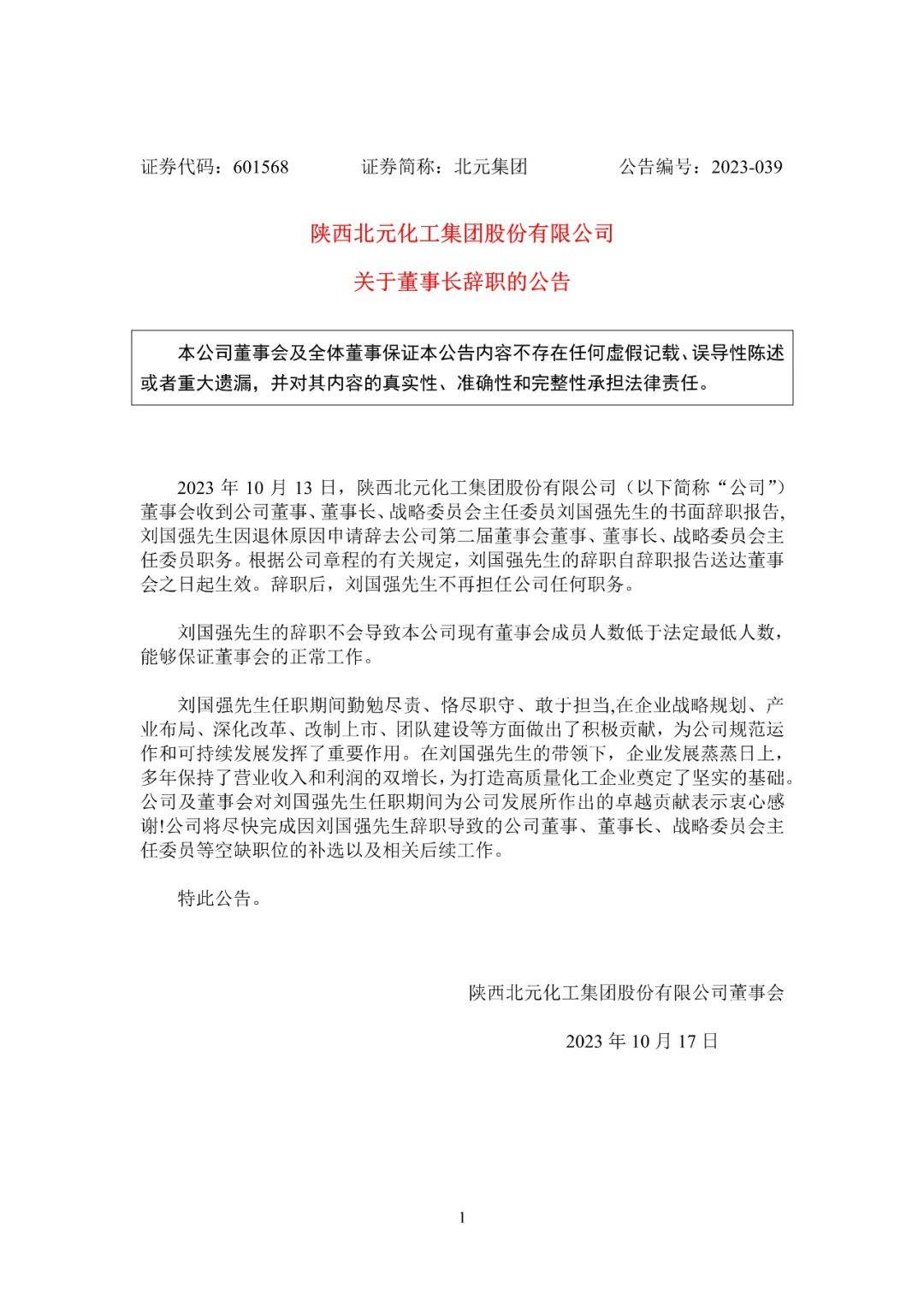 劉國(guó)強(qiáng)辭去陜西北元化工集團(tuán)股份有限公司(簡(jiǎn)稱“北元集團(tuán)”)第二屆董事會(huì)董事、董事長(zhǎng)、戰(zhàn)略委員會(huì)主任委員職務(wù)。