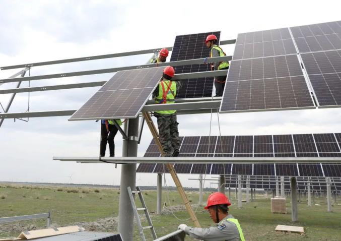 7月11日,在張家口市康??h張紀(jì)鎮(zhèn),工人在一處光伏發(fā)電場(chǎng)建設(shè)工地施工。新華社記者 楊世堯 攝