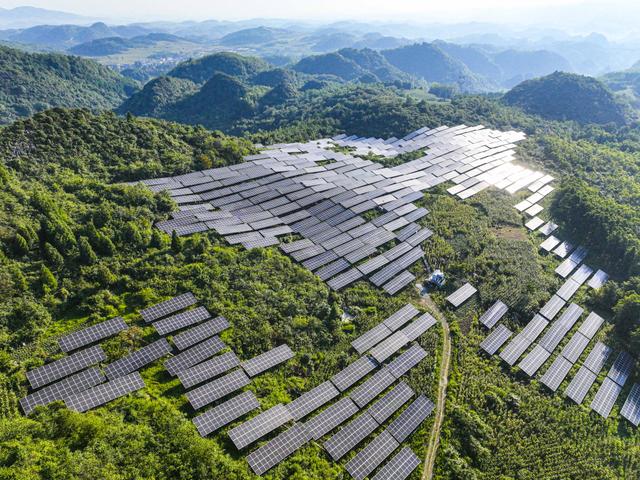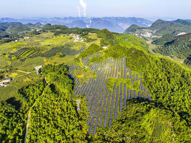 8月14日,黔西市五里布依族苗族鄉(xiāng)石門村,一塊塊藍(lán)色光伏板與村莊、道路、青山遙相呼應(yīng),共繪出一幅和美鄉(xiāng)村生態(tài)畫卷。