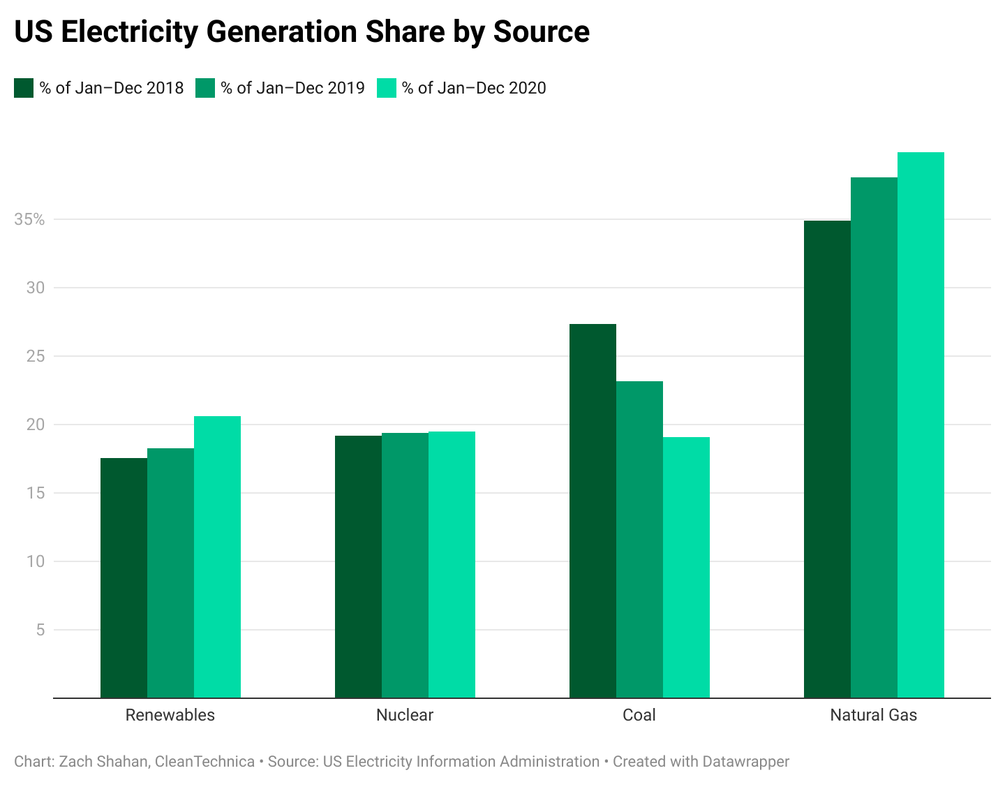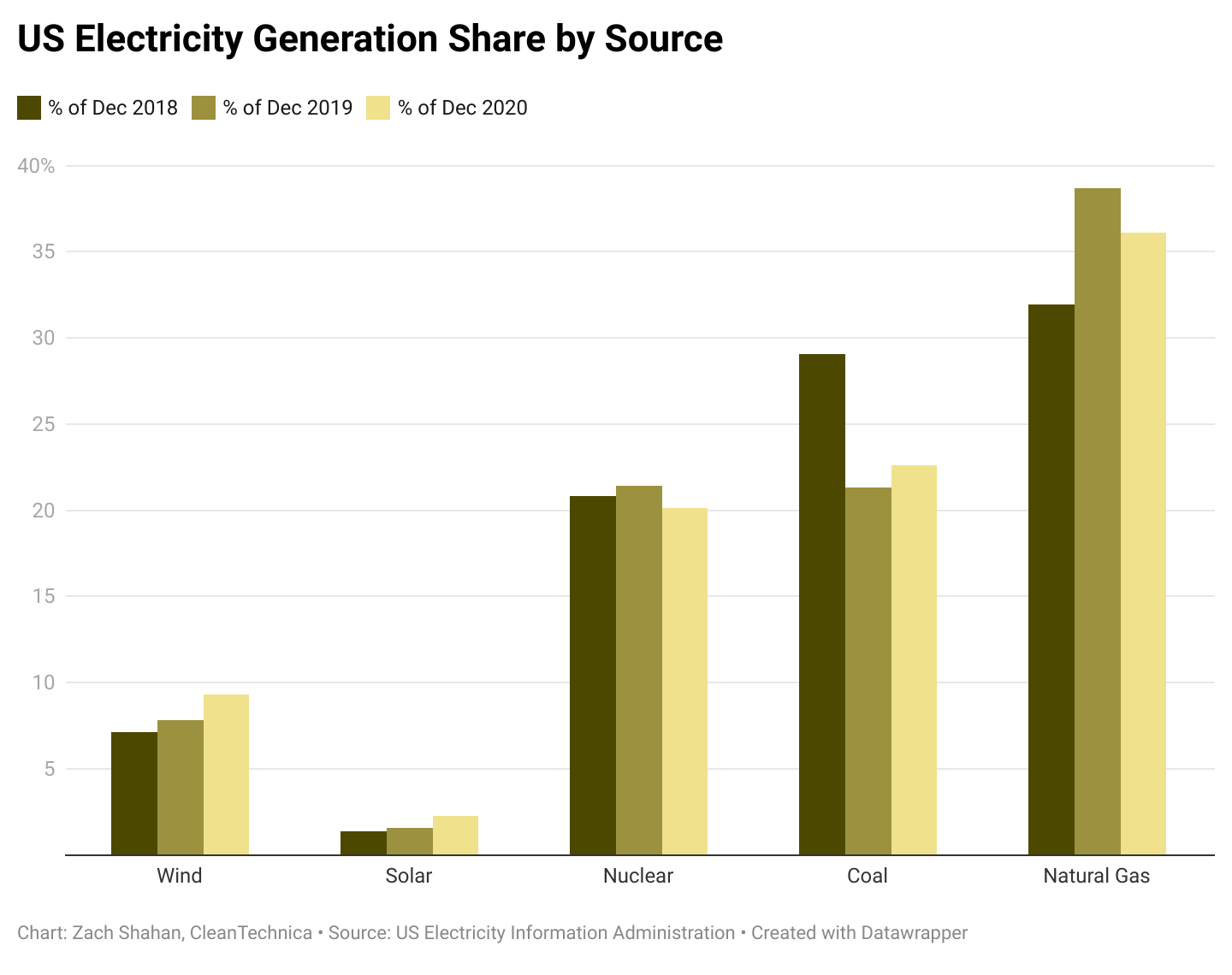 另一方面,煤炭發(fā)電量正在不斷下降。從2018-2020年,煤炭占美國發(fā)電量的比例從27.3%下降至19.1%。煤炭也是美國發(fā)電量中顯著下降的唯一來源。過去三年來,天然氣份額從34.9%提高至39.9%,核電從19.2%提高至19.5%。