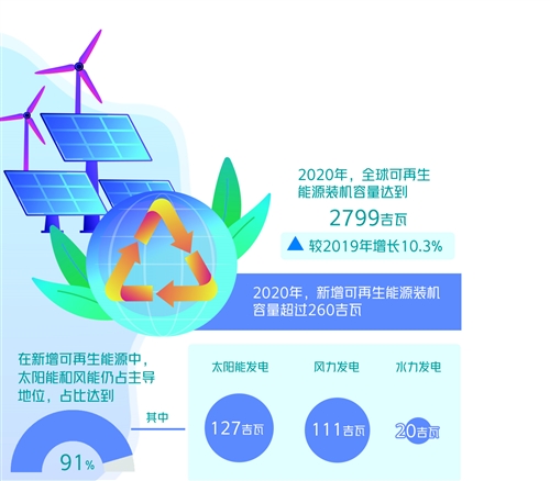 總部位于阿聯(lián)酋首都阿布扎比的國際可再生能源署(IRENA)近日發(fā)布報告《可再生能源裝機容量數(shù)據(jù)2021》。報告稱,2020年,全球可再生能源裝機容量達到2799吉瓦,較2019年增長10.3%;新增可再生能源裝機容量超過260吉瓦。