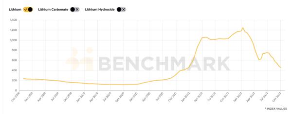 從2018年10月至今的基準鋰價格指數(shù)(按市場交易量加權) 來源:Benchmark Mineral Intelligence