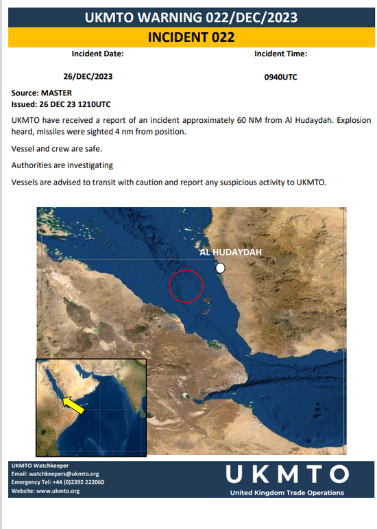 通報顯示,爆炸發(fā)生的大概位置在距離也門西海岸荷臺達港約60海里(約111公里)的紅海海域,距離報告本次事件的船只約8公里。英國海上貿(mào)易行動辦公室表示,這艘船在26日航行時看到事發(fā)地點出現(xiàn)了2架無人機和導彈(或指發(fā)射物),隨后聽到了爆炸聲。報道稱,無人機沒有裝載武器,目前尚不清楚爆炸的具體原因。