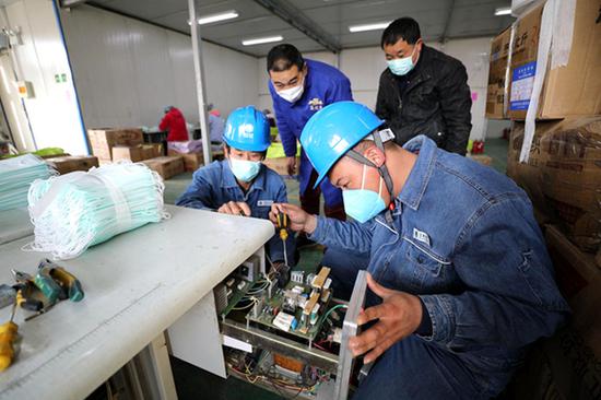 2月13日,在蕭縣丁里工業(yè)園,蕭縣供電公司副總經(jīng)理王海濤帶著營銷部負(fù)責(zé)人和供電所服務(wù)人員來到生產(chǎn)醫(yī)用防護(hù)口罩的華源家居用品公司,為該企業(yè)全面檢查用電設(shè)備、優(yōu)化保供電方案,設(shè)立常駐保供電客戶經(jīng)理,確保企業(yè)用電無憂。(馮巖 李令響)