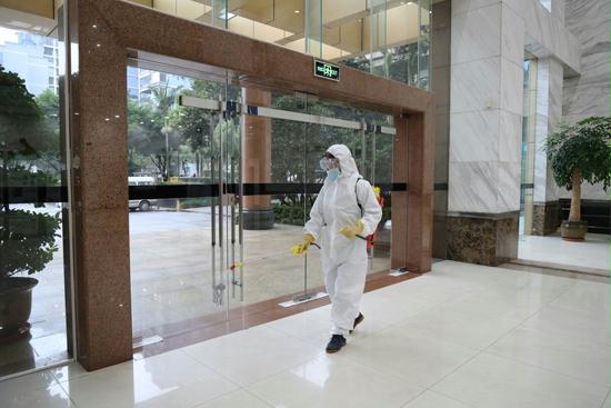 國網重慶北碚供電公司后勤人員對辦公大樓進行殺菌消毒