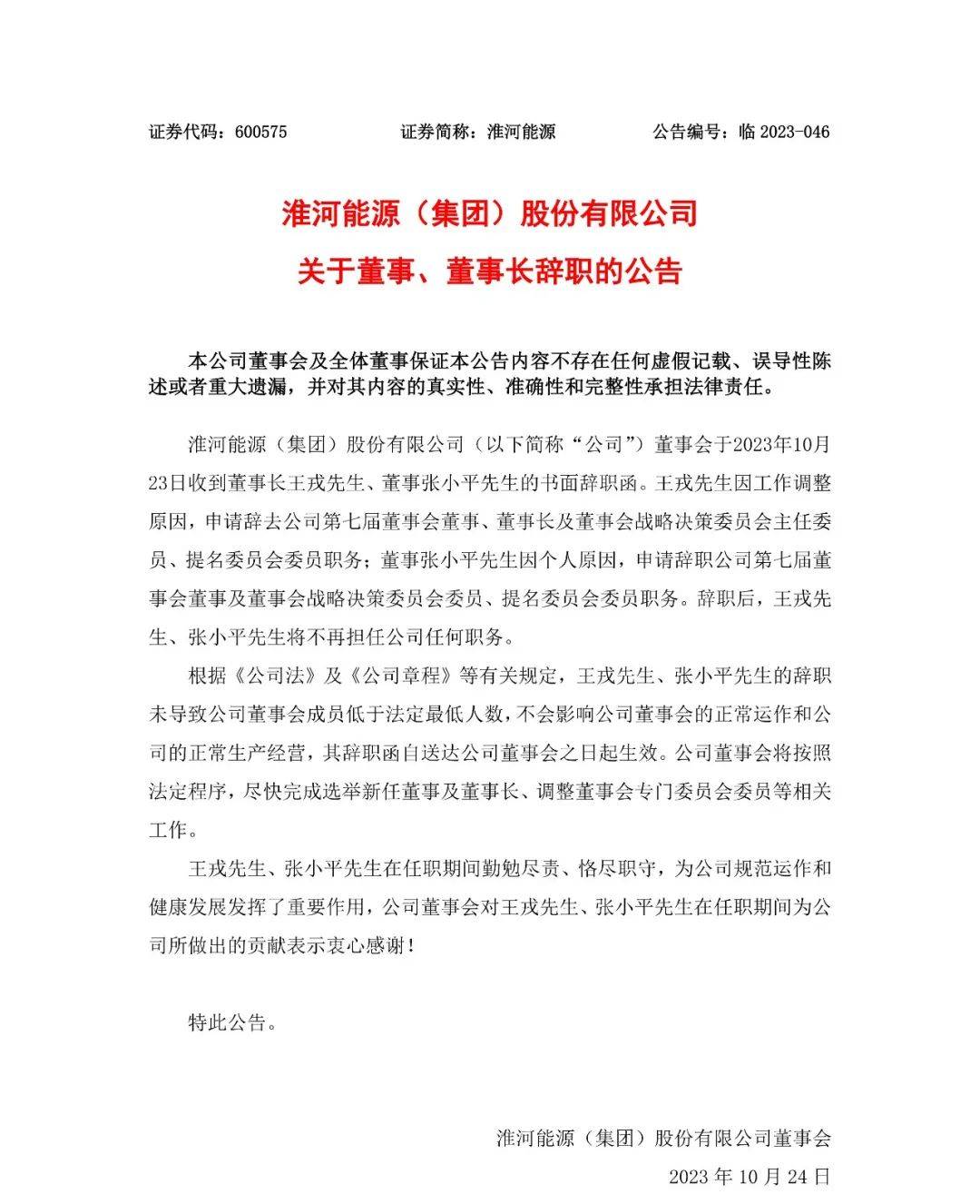 10月23日,淮河能源發(fā)布公告,董事會(huì)于2023年10月23日收到董事長(zhǎng)王戎先生、董事張小平先生的書面辭職函。王戎先生因工作調(diào)整原因,申請(qǐng)辭去公司第七屆董事會(huì)董事、董事長(zhǎng)及董事會(huì)戰(zhàn)略決策委員會(huì)主任委員、提名委員會(huì)委員職務(wù);董事張小平先生因個(gè)人原因,申請(qǐng)辭職公司第七屆董事會(huì)董事及董事會(huì)戰(zhàn)略決策委員會(huì)委員、提名委員會(huì)委員職務(wù)。