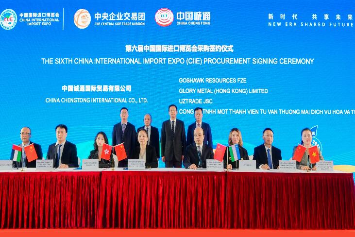 11月7日,中國誠通4家所出資企業(yè)分別與來自阿聯(lián)酋、巴西等14個國家和地區(qū)的28家客商簽署采購協(xié)議。簽約金額合計達18.5億美元,較上屆進博會增長12%,較首屆增長106%。采購產(chǎn)品既有鉻礦、錳礦、煤炭、紙漿、甲醇、棉紗等重要資源型產(chǎn)品,也有如電極、電池裝配設備等高新技術產(chǎn)品首次參加簽約。