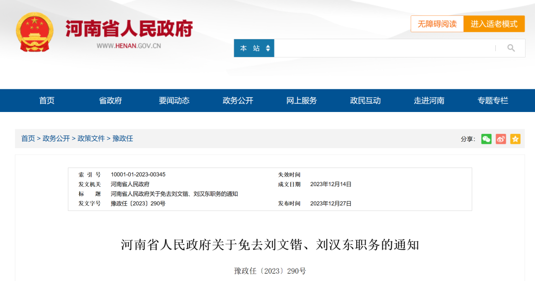 12月27日,河南省政府發(fā)布通知稱,免去劉文鍇的華北水利水電大學(xué)校長(zhǎng)職務(wù);免去劉漢東的華北水利水電大學(xué)副校長(zhǎng)職務(wù)。