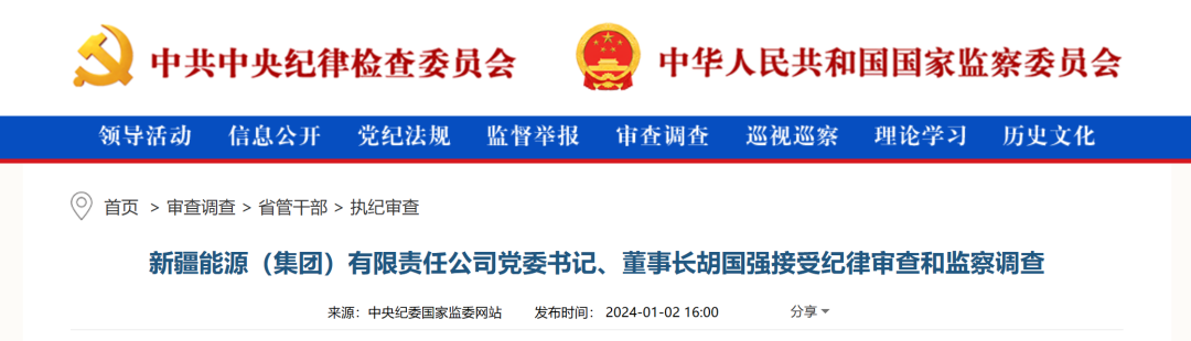 據(jù)中央紀(jì)委國家監(jiān)委網(wǎng)站1月2日消息,據(jù)新疆維吾爾自治區(qū)紀(jì)委監(jiān)委消息:新疆能源(集團(tuán))有限責(zé)任公司黨委書記、董事長胡國強(qiáng)涉嫌嚴(yán)重違紀(jì)違法,目前正接受新疆維吾爾自治區(qū)紀(jì)委監(jiān)委紀(jì)律審查和監(jiān)察調(diào)查。