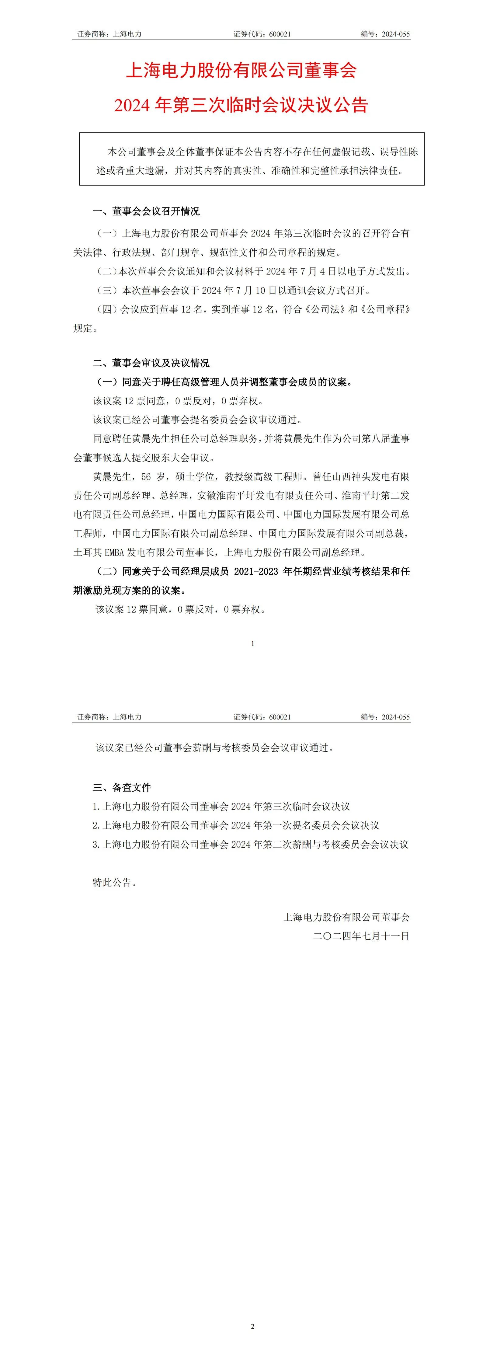 7月11日,上海電力公告,董事會同意關于聘任高級管理人員并調整董事會成員的議案,同意聘任黃晨先生擔任公司總經理職務,并將黃晨先生作為公司第八屆董事會董事候選人提交股東大會審議。