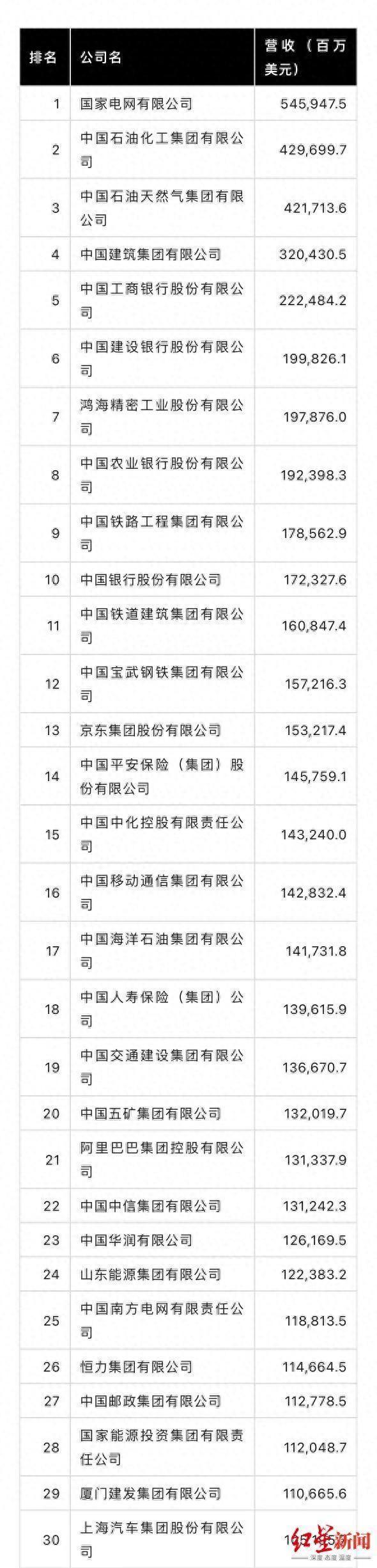從排名看,國家電網(wǎng)有限公司以5459億美元的營收位居榜首,中國石化和中國石油分列榜單第二位和第三位,位列第四的是中國建筑集團。中國工商銀行(601398.SH)位列第五,排名較去年上升1位。蘋果最大代工企業(yè)鴻海精密位列第七,較去年下降2位,仍是排名最高的中國臺灣地區(qū)公司。