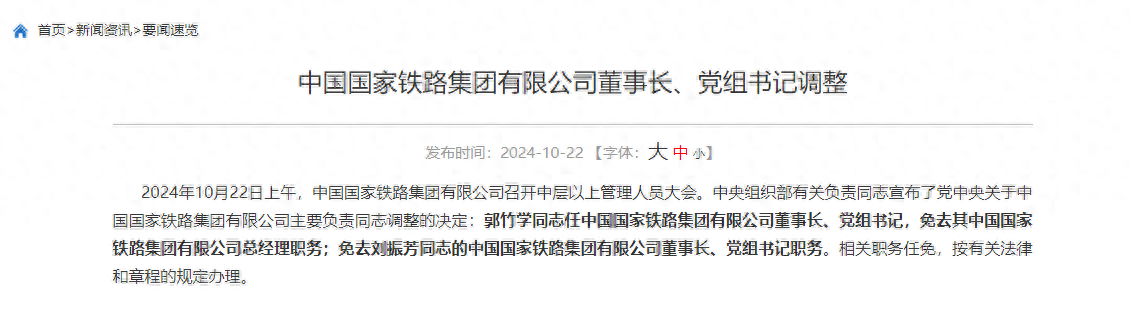 中央組織部有關(guān)負(fù)責(zé)同志宣布了黨中央關(guān)于中國(guó)國(guó)家鐵路集團(tuán)有限公司主要負(fù)責(zé)同志調(diào)整的決定:郭竹學(xué)同志任中國(guó)國(guó)家鐵路集團(tuán)有限公司董事長(zhǎng)、黨組書(shū)記,免去其中國(guó)國(guó)家鐵路集團(tuán)有限公司總經(jīng)理職務(wù);免去劉振芳同志的中國(guó)國(guó)家鐵路集團(tuán)有限公司董事長(zhǎng)、黨組書(shū)記職務(wù)。
