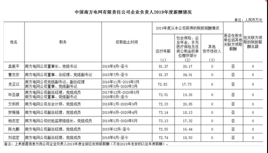 中國電力網(wǎng)(微信公眾號:China_Power_com_cn)獲悉,近日,國家電網(wǎng)、南方電網(wǎng)、華能集團、國家能源集團、中廣核、中國能建、中國電建等能源電力央企發(fā)布了企業(yè)負(fù)責(zé)人2019年度薪酬情況。