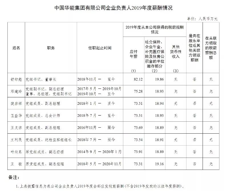國家電力投資集團有限公司企業(yè)負(fù)責(zé)人2019年度薪酬情況