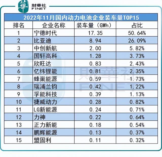 寧德時(shí)代(300750.SZ)在2022年1-11月動(dòng)力電池的累計(jì)裝機(jī)量124GWh,國(guó)內(nèi)市占率48.02%,比位居第二的比亞迪23.11%的市占率、第三的中創(chuàng)新航6.73%的市占率要高出不少。