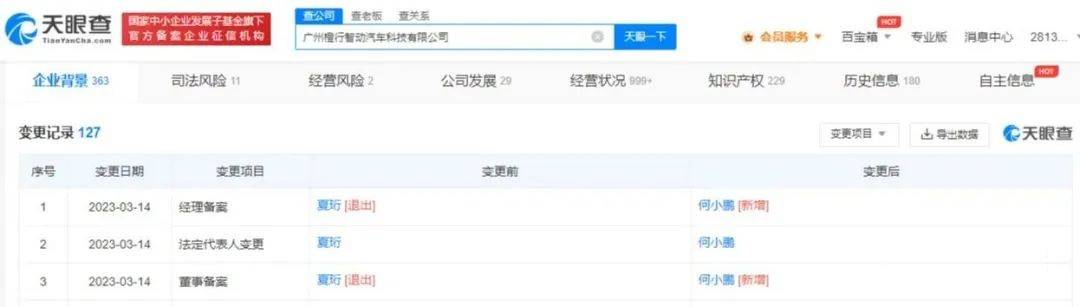 根據天眼查App顯示,近日,廣州橙行智動汽車科技有限公司發(fā)生工商變更,夏珩卸任法定代表人、執(zhí)行董事、經理,由何小鵬接任。不久前,夏珩已接連卸任廣東小鵬汽車科技有限公司、廣州小鵬汽車科技有限公司職務,并均由何小鵬接任。