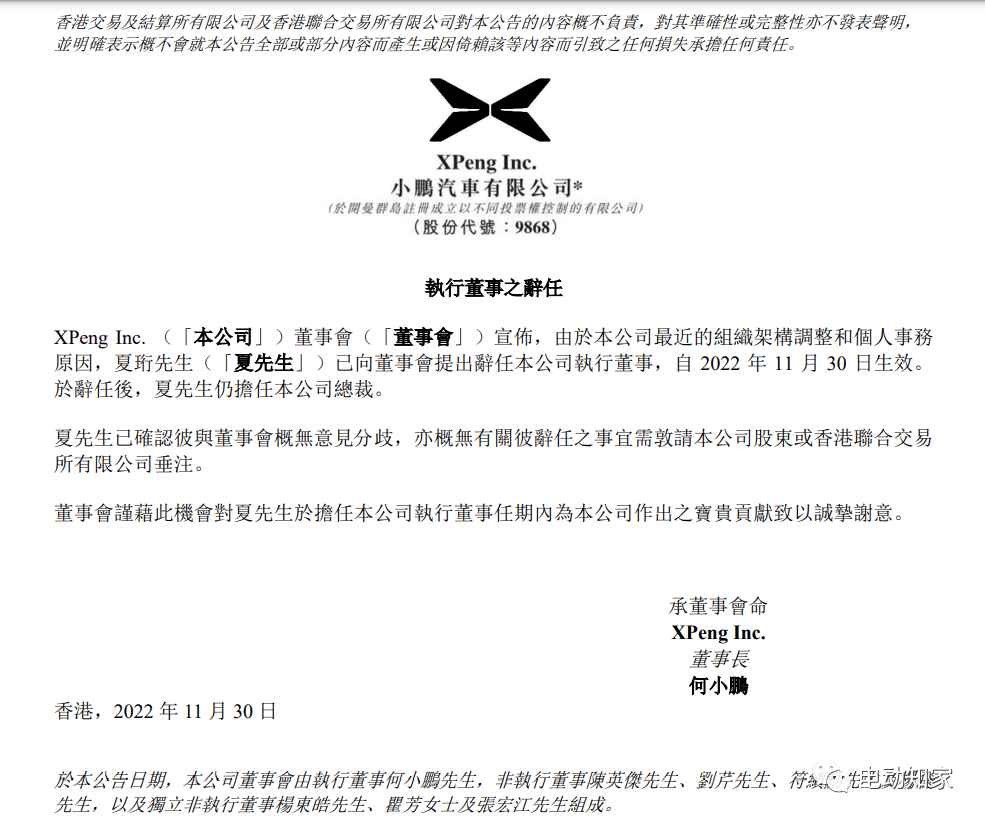 不久前,夏珩更是接連卸任廣東小鵬汽車科技有限公司、廣州小鵬汽車科技有限公司職務,并均由何小鵬接任。2022年11月30日,小鵬汽車發(fā)布公告稱,因公司組織架構調整及個人事務原因,小鵬汽車聯合創(chuàng)始人、總裁夏珩將辭去公司董事會執(zhí)行董事職務,11月30日生效。辭任執(zhí)行董事后,夏珩仍將擔任小鵬汽車總裁一職。