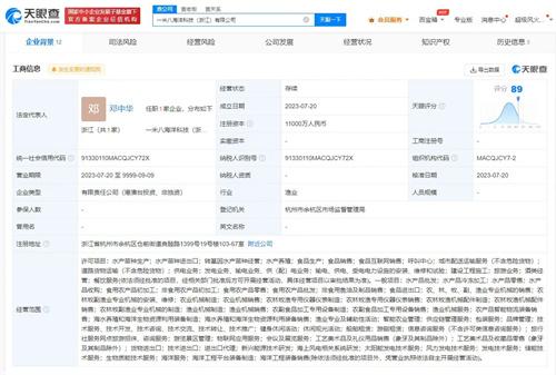 天眼查App顯示,一米八海洋科技(浙江)有限公司的法定代表人為鄧中華,注冊資本1.1億人民幣,經(jīng)營范圍包括水產(chǎn)養(yǎng)殖、食品銷售、水產(chǎn)品冷凍加工、輸電供電、海上風(fēng)電相關(guān)系統(tǒng)研發(fā)、儲(chǔ)能技術(shù)服務(wù)等。