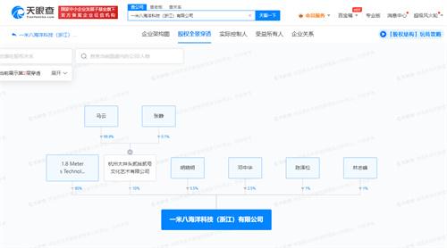 股權(quán)全景穿透圖顯示,該公司由1.8Meters Technology Holding Limited、杭州大井頭貳拾貳號(hào)文化藝術(shù)有限公司以及胡曉明等4名自然人共同持股。其中,杭州大井頭貳拾貳號(hào)文化藝術(shù)有限公司由馬云持股99.9%;持有一米八海洋科技5.5%股權(quán)并擔(dān)任董事長的胡曉明則曾任螞蟻集團(tuán)CEO。