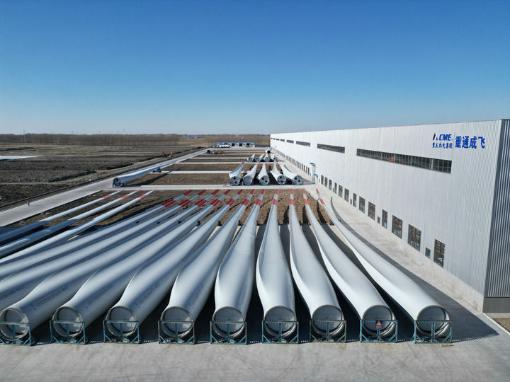 2023年3月5日拍攝的吉林重通成飛新材料股份公司大安公司生產(chǎn)的風機葉片(無人機照片)。新華社記者 姜明明 攝