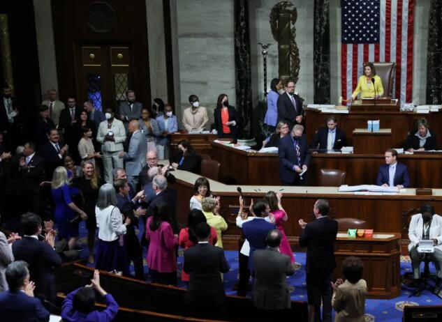 美眾議院通過《反通脹法案》現(xiàn)場。注意星條旗左側(cè)纏繞月桂葉的法西斯標(biāo)志浮雕