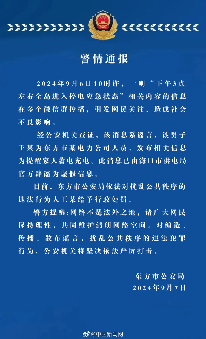 經(jīng)公安機(jī)關(guān)查證,該消息系謠言,該男子王某為東方市某電力公司人員,發(fā)布相關(guān)信息為提醒家人蓄電充電。目前,東方市公安局依法對(duì)擾亂公共秩序的違法行為人王某給予行政處罰。