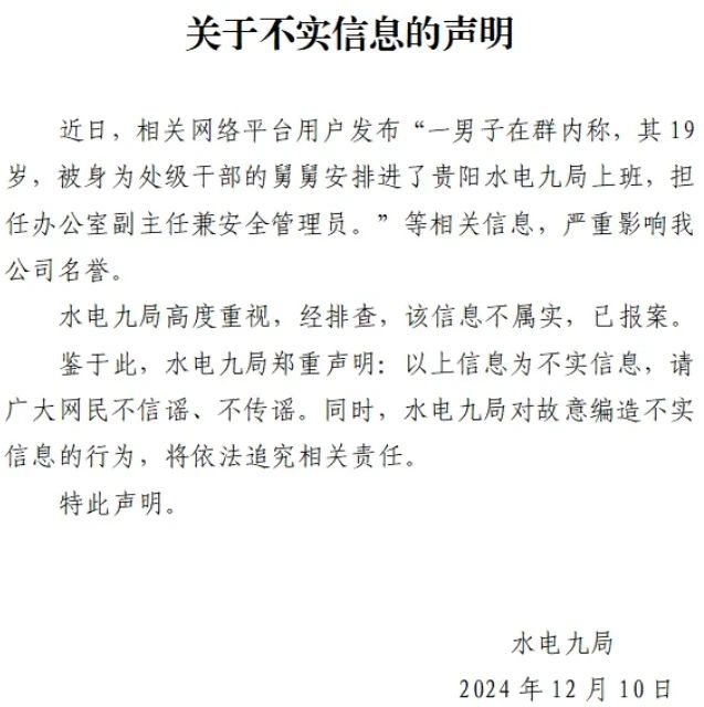 男子稱19歲被舅舅安排任辦公室副主任?水電九局聲明:信息不實,已報案。