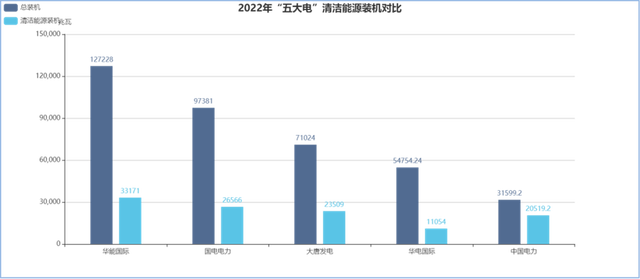 2022年,煤炭價格依舊處于高位,全年北方港5500大卡動力煤市場均價為1296元/噸,同比上漲24.2%。體現(xiàn)在業(yè)績層面上,“五大電”中清潔能源裝機占比越高的企業(yè),越能夠受益于這樣的市場環(huán)境,從而造成業(yè)績極端分化。