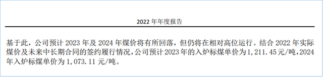 在2022年財報中,華能國際明確表示預(yù)計2023年及2024年煤價將有所回落,但仍將在相對高位運行。并以南京電廠舉例,結(jié)合2022年實際煤價及未來中長期合同的簽約履行情況,預(yù)計2023年的入爐標(biāo)煤單價為1,211.45元/噸,2024年入爐標(biāo)煤單價為1,073.11元/噸。