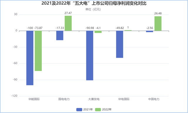 2022年,中國電力歸母凈利潤為26.48億元,2021年為-2.56億元,同比扭虧為盈;國電電力歸母凈利潤為27.47億元,2021年為-17.33億元,同比扭虧為盈;華電國際歸母凈利潤為1億元,2021年為-49.82億元,同比扭虧為盈;大唐發(fā)電歸母凈利潤為-4.1億元,2021年為-90.98億元,同比增長95.49%;華能國際歸母凈利潤為-73.87億元,2021年為-100億元,虧損額度有所減少。