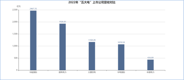 2022年,“五大電”旗下主體發(fā)電上市公司營收皆有增長,但座次沒有發(fā)生太大變化,華能國際以2467.25億營收依舊領(lǐng)銜。