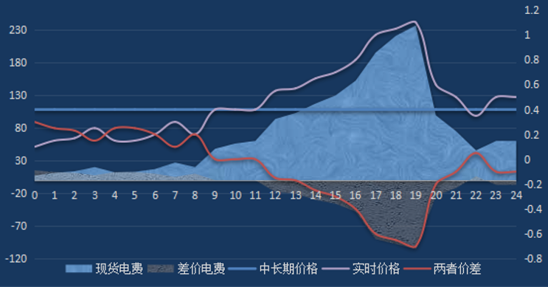 500千伏響布一、二線與500千伏坤德一、二線組成了“響布雙(送響沙灣)+坤德雙(送春坤山)”斷面,斷面輸送最大功率是260萬千瓦,并不能夠支撐大烏海區(qū)域全部的外送需求,這就造成了蒙西電網(wǎng)在整體緊平衡(與全國情況相同缺乏煤電投資)的情況下東部緊張、西部寬松的供求形勢。電力現(xiàn)貨市場運行后,供需情況自然就反映為現(xiàn)貨市場價格降低,大烏海區(qū)域部分時間各電廠現(xiàn)貨節(jié)點電價較低,這也符合市場的基本規(guī)律。加之電力市場建設初期國家更重視保護用戶的權(quán)益,因此各試點均將參考結(jié)算點選擇在用戶側(cè)參考結(jié)算點(由電源承受風險),同時為了使不同地區(qū)用戶之間的價格差距不至于太大,往往不按照用戶所在節(jié)點電價結(jié)算,而是為全體用戶選擇了同一個參考結(jié)算點,這樣的做法實際上要求電源通過差價合約為用戶保價,并且犧牲了電力現(xiàn)貨市場優(yōu)化用戶側(cè)資源的部分能力。如圖3所示,在部分時間內(nèi),阻塞斷面內(nèi)的電源在承受較低現(xiàn)貨價格的同時,還要向參考結(jié)算點價格高于合同價的用戶支付價差電費,極端情況下,電源現(xiàn)貨電費(藍色面積)甚至小于價差電費(灰色面積),最終形成了負結(jié)算電費(紅色面積),當然這種情況在大烏海區(qū)域出現(xiàn)的不多,更多的表現(xiàn)為收入降低。
